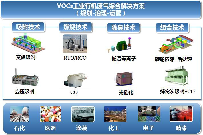 VOCs處理方法有數十種,其原理主要有回收有價值溶劑的回收技術和分解VOCs分子的破壞技術兩大類,實際應用中更多是采用組合式技術。比如:采用濃縮和燃燒結合的技術治理低濃度大風量廢氣,減少裝置投資;采用催化燃燒(CO)或蓄熱式燃燒(RTO)技術實現低能耗下VOCs的處理;根據VOCs自身溶解度、沸點等特性選擇變溫吸附或變壓吸附進行溶劑的回收,具體如何選擇取決于客戶生產線的工況。