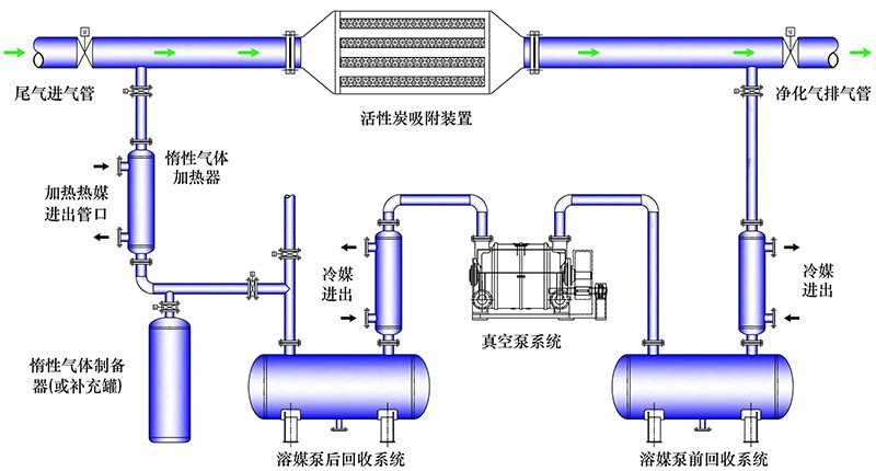 我公司設計生產的活性炭脫附裝置,是根據不同吸附質的沸點和臨界點,用一定溫度下的惰性氣體將吸附質析出。惰性氣體經過加熱器加熱到一定溫度進入飽和活性炭裝置系統,惰性氣體將飽和活性炭內的吸附質加熱到沸點,吸附質隨小分子惰性氣體揮發出來進入冷凝器通過一次冷媒冷凝,大部分吸附質冷凝成液體進入溶媒回收系統氣液分離與惰性氣體分開。物質的吸附量是隨壓力的升高而升高的,隨壓力的降低而降低。含有少量吸附質的惰性氣體經真空泵減壓后進入二次冷凝器,經二次降溫冷凝將少量的吸附質分離回收。處理后的惰性氣體再經干燥器干燥,加熱器加熱進入活性炭吸附裝置,循環使用。在實際工作中,這種方法也是常用的脫附方法。