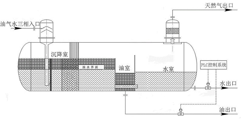 三相分離器由分離筒體、捕霧器、布液板、反射板、聚結(jié)填料、分程隔板、導(dǎo)水管、液位計、安全閥、液位控制閥等附件構(gòu)成,具有工藝簡單,投資少,便于管理和維護,指標(biāo)穩(wěn)定可靠的特點,有利于實現(xiàn)原油處理工藝密閉。